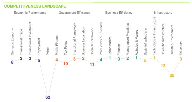 全球競爭力報告報告覆蓋了全球67個經濟體,并對這些國家在經濟表現、政府效率、商業(yè)活力和基礎設施建設等四大領域的表現進行了全面的評估,包含了164項競爭力指標。
