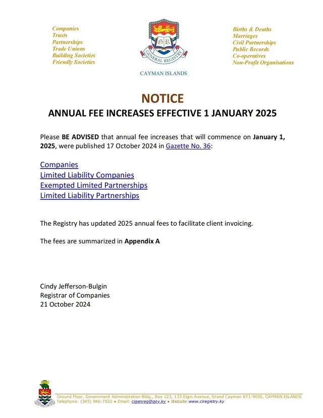 重要通知 | 開曼群島公司、有限責(zé)任公司和合伙企業(yè)年費(fèi)將于2025年1月1日起上調(diào)