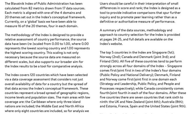 英國牛津大學(xué)的布拉瓦尼克政府學(xué)院于2024年12月5日公布了最新布拉瓦尼克公共行政指數(shù)報(bào)告(Blavatnik Index of Public Administration),比較了全球120個國家的公共管理部門。新加坡民事服務(wù)全球居冠。新加坡在邊境服務(wù)、稅務(wù)管理創(chuàng)新策略和實(shí)踐方面領(lǐng)先全球其他國家。
