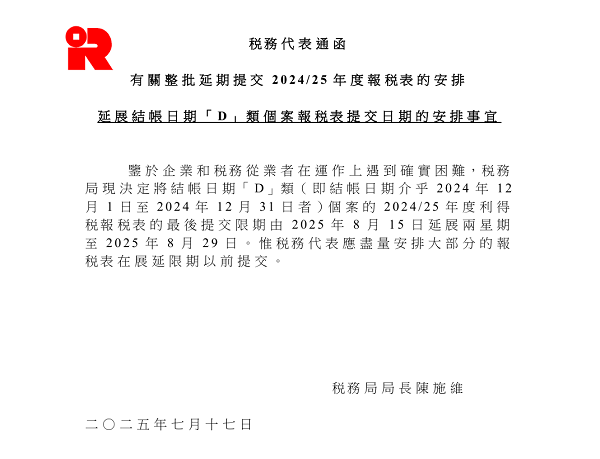 香港稅務局于2025年7月17日發(fā)布通告,鑒于企業(yè)與稅務服務機構的年底結賬操作困難,正式延長D類公司(財務年度結束于2024年12月1日-31日)的利得稅申報期限——由原定的2025年8月15日延后兩周至2025年8月29日。本次延期旨在緩解申報壓力,但需注意8月29日為最終截止日,逾期將面臨合規(guī)風險。